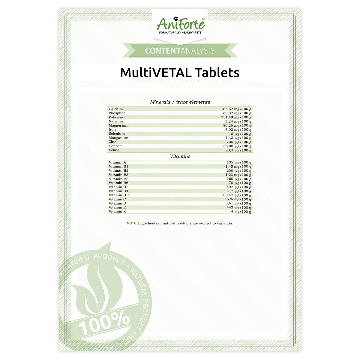 AniForte MultiVETAL Tablets are made from 100% natural ingredients and contain large quantities of the most important vitamins, essential minerals and trace elements which are easily absorbed by your pet.