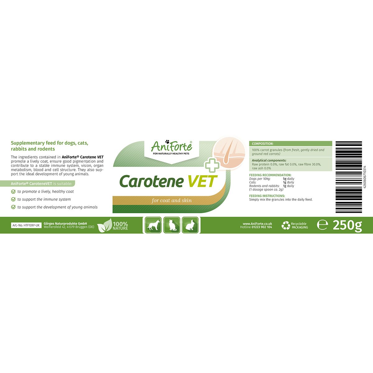 AniForte Carotene VET contains purely natural, fine granules made from earthy, high-grade carrots. It is rich in carotene, which includes essential vitamins and trace elements. Its beneficial elements may aid coat health, promote natural immunity and support younger animal development.