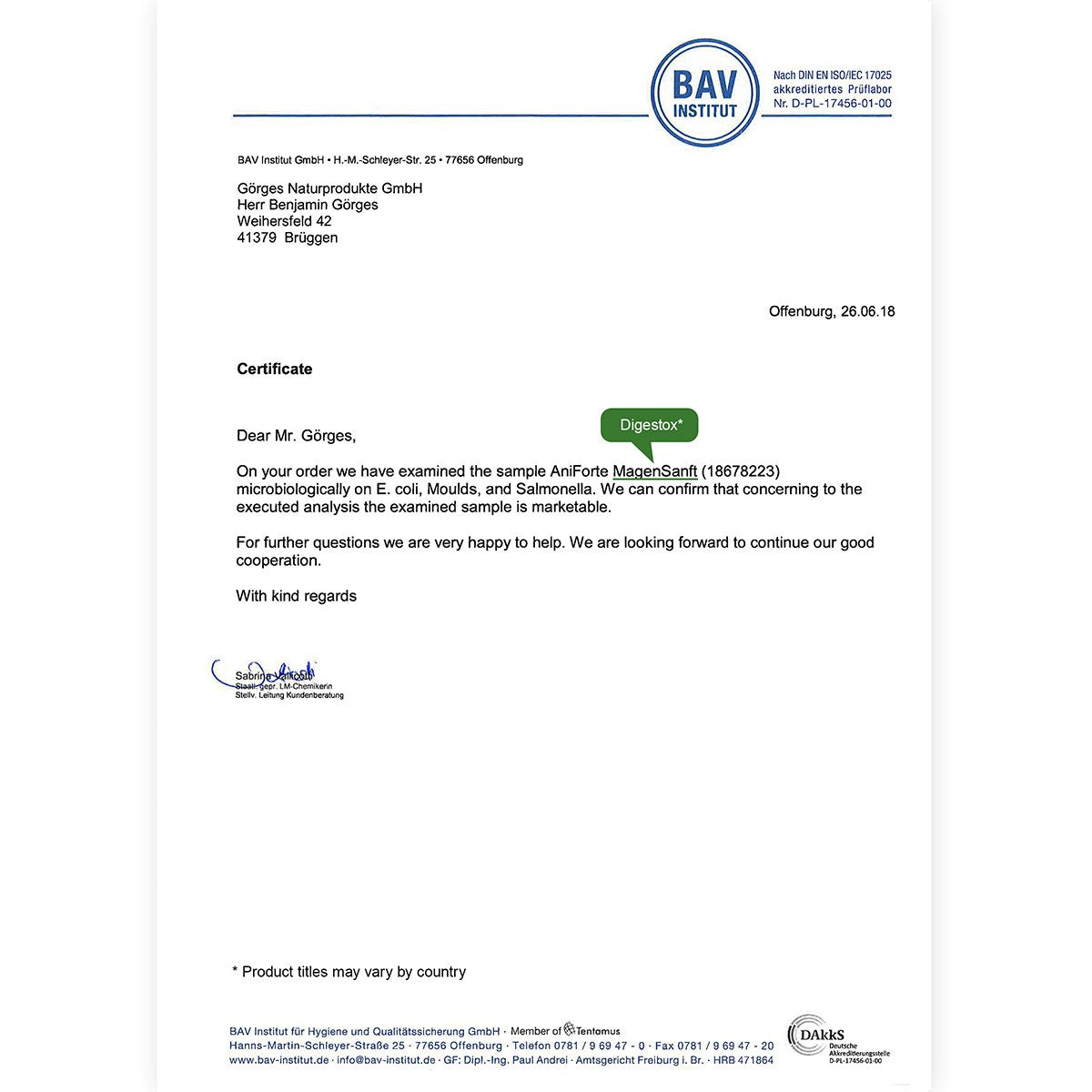 Mix AniForte Digestox powder with water and add to feed. Dogs per 10kg require 1 measuring spoon per day (1 measuring spoon = 2g). Supplement for 6 to 8 weeks.