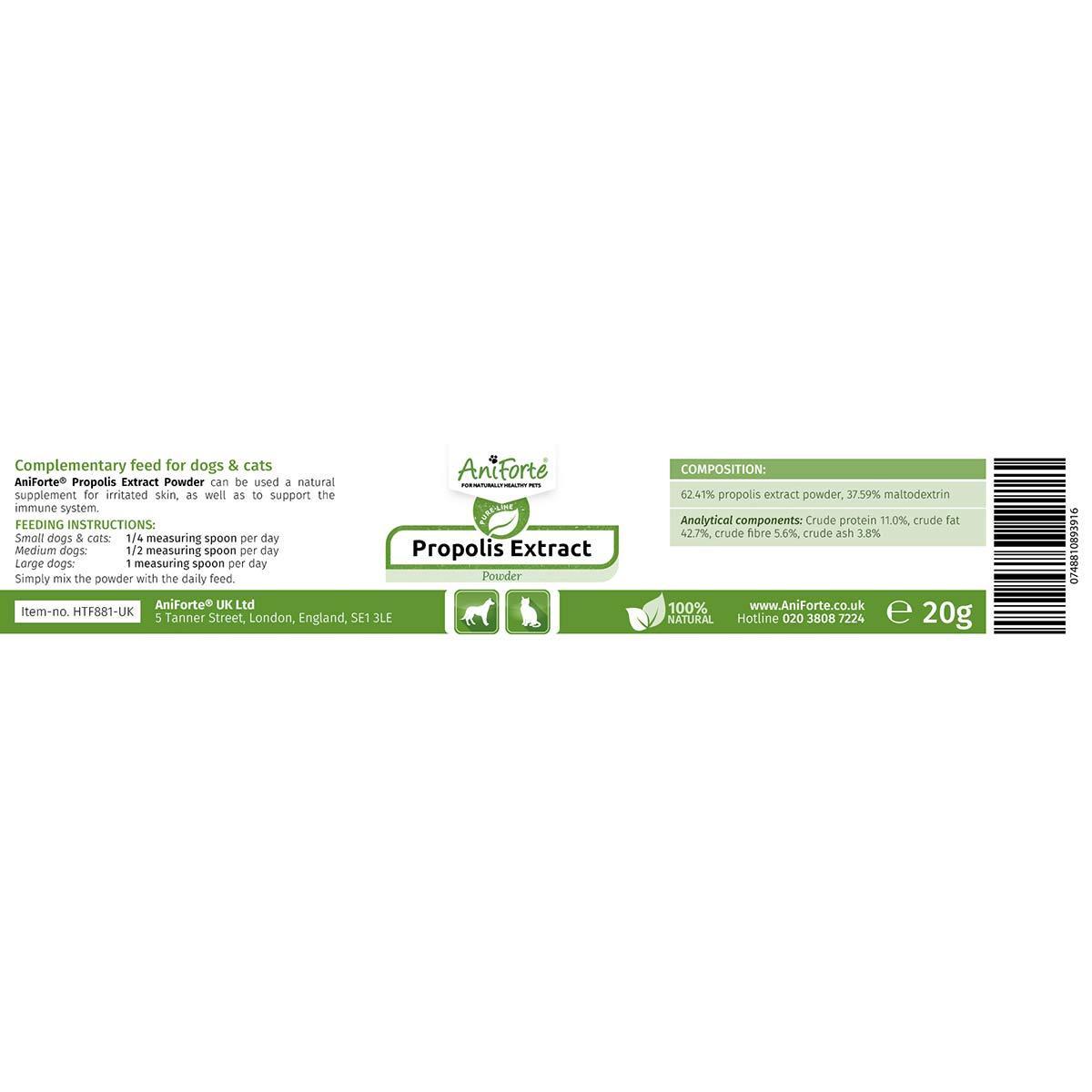 AniForte Propolis Extract also called “bee glue”, is a natural ingredient used by bees to seal small openings and cracks in their hives. It can be used as a natural supplement for dogs and cats to relieve irritated skin, as well to support and aid the immune system.