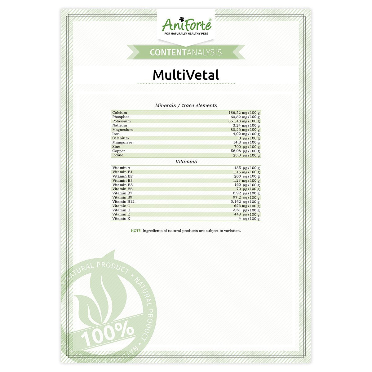 AniForte MultiVETAL Powder is made from 100% natural ingredients and contains large quantities of the most important vitamins, essential minerals and trace elements which are easily absorbed by your pet.