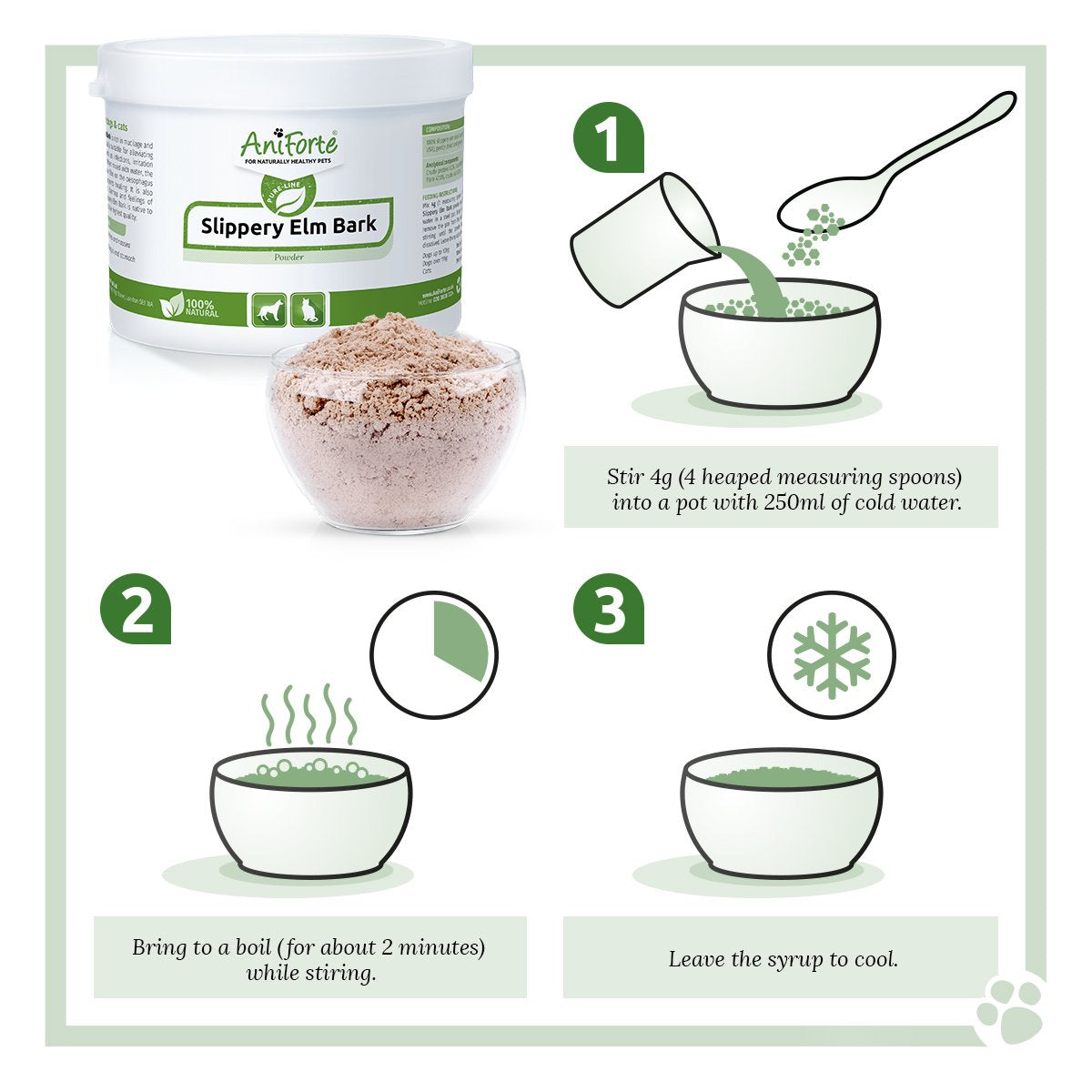 Mix 4g (1 measuring spoon = 1g) AniForte Slippery Elm Bark powder into 250ml of cold water in a steel pan. Bring to the boil, then remove the pan from the heat and continue stirring until the powder has completely dissolved. Leave the syrup to cool.